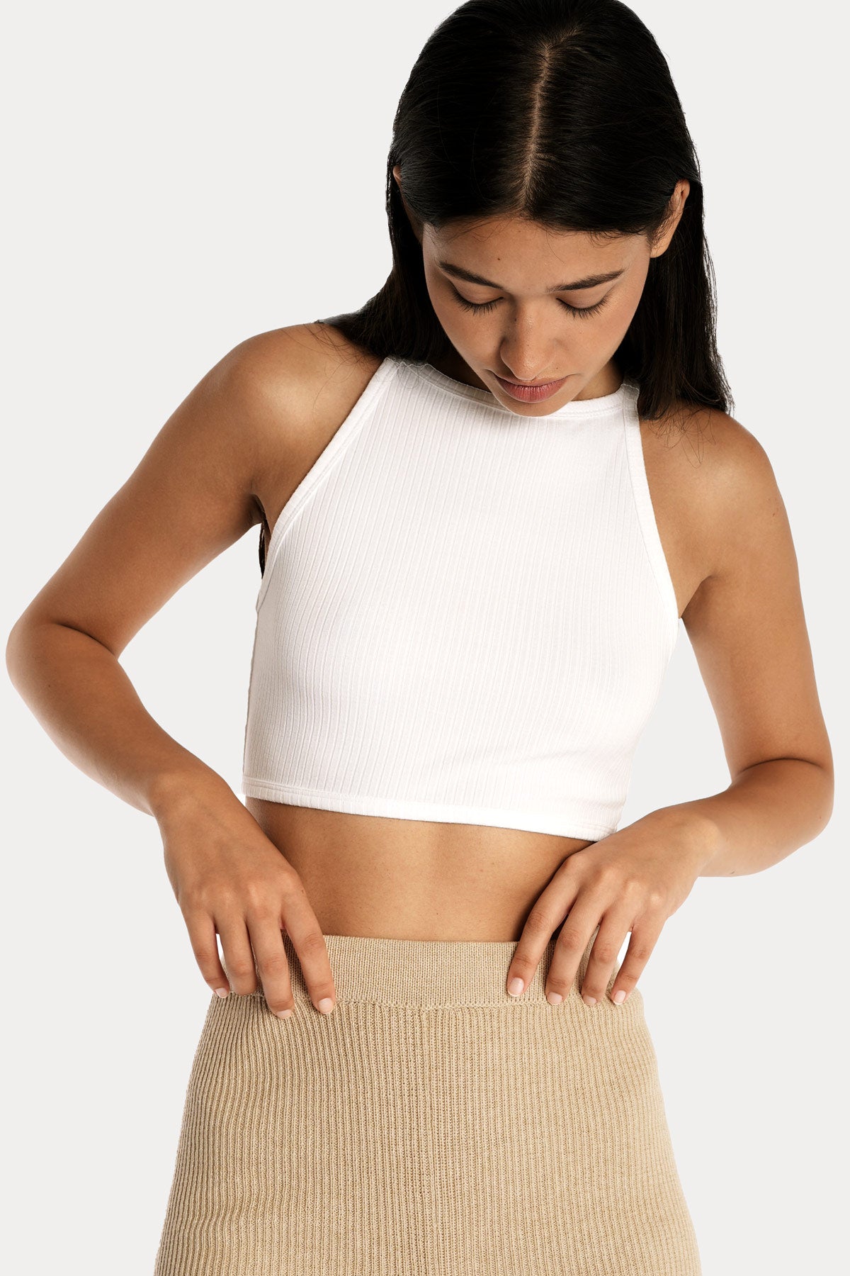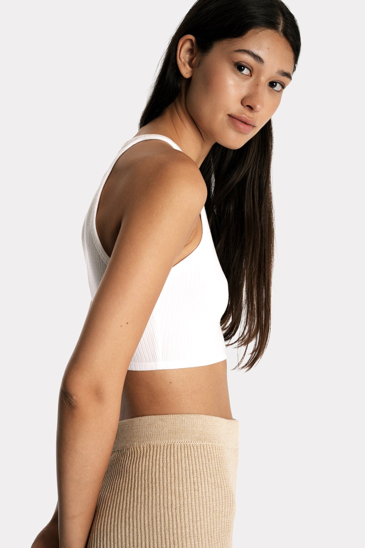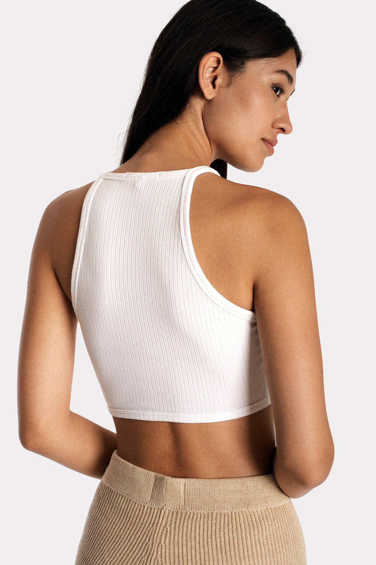 This minimal, easy-to-wear, mindful capsule wardrobe essential is designed for everyday versatility. Crafted with soft, eco-friendly ribbed LENZING™ ECOVERO™ and clean, considered lines, it features fixed straps and a high neckline giving it a simple, contemporary feel.