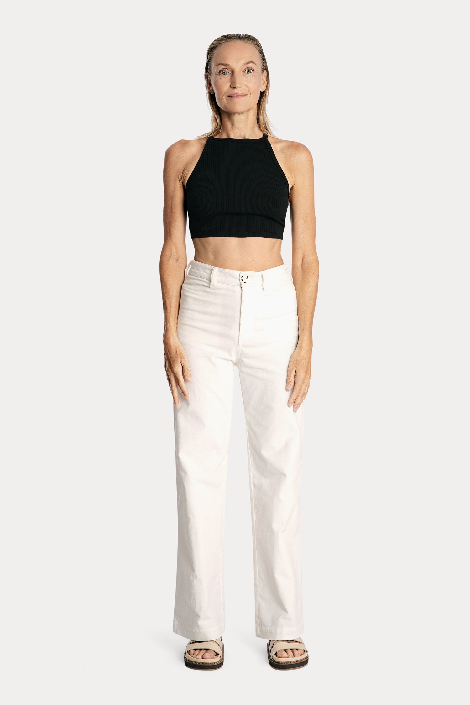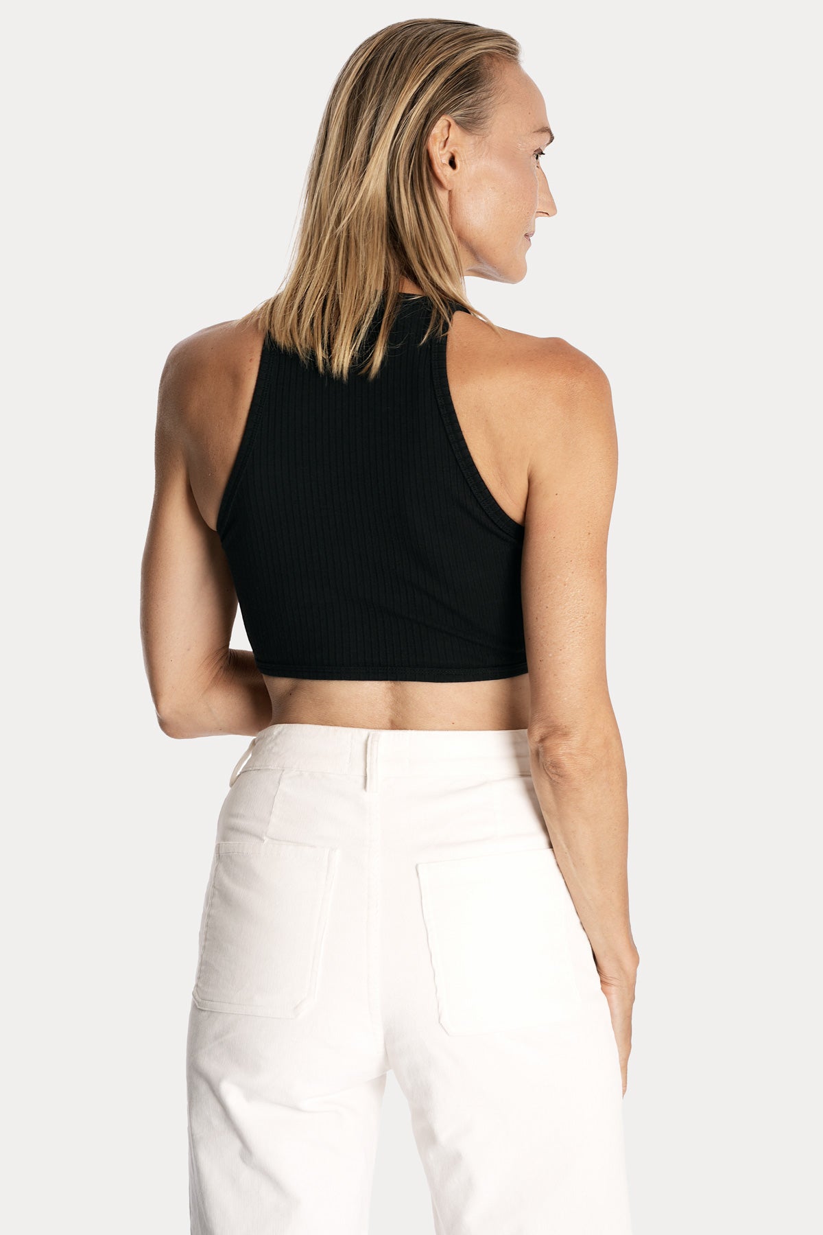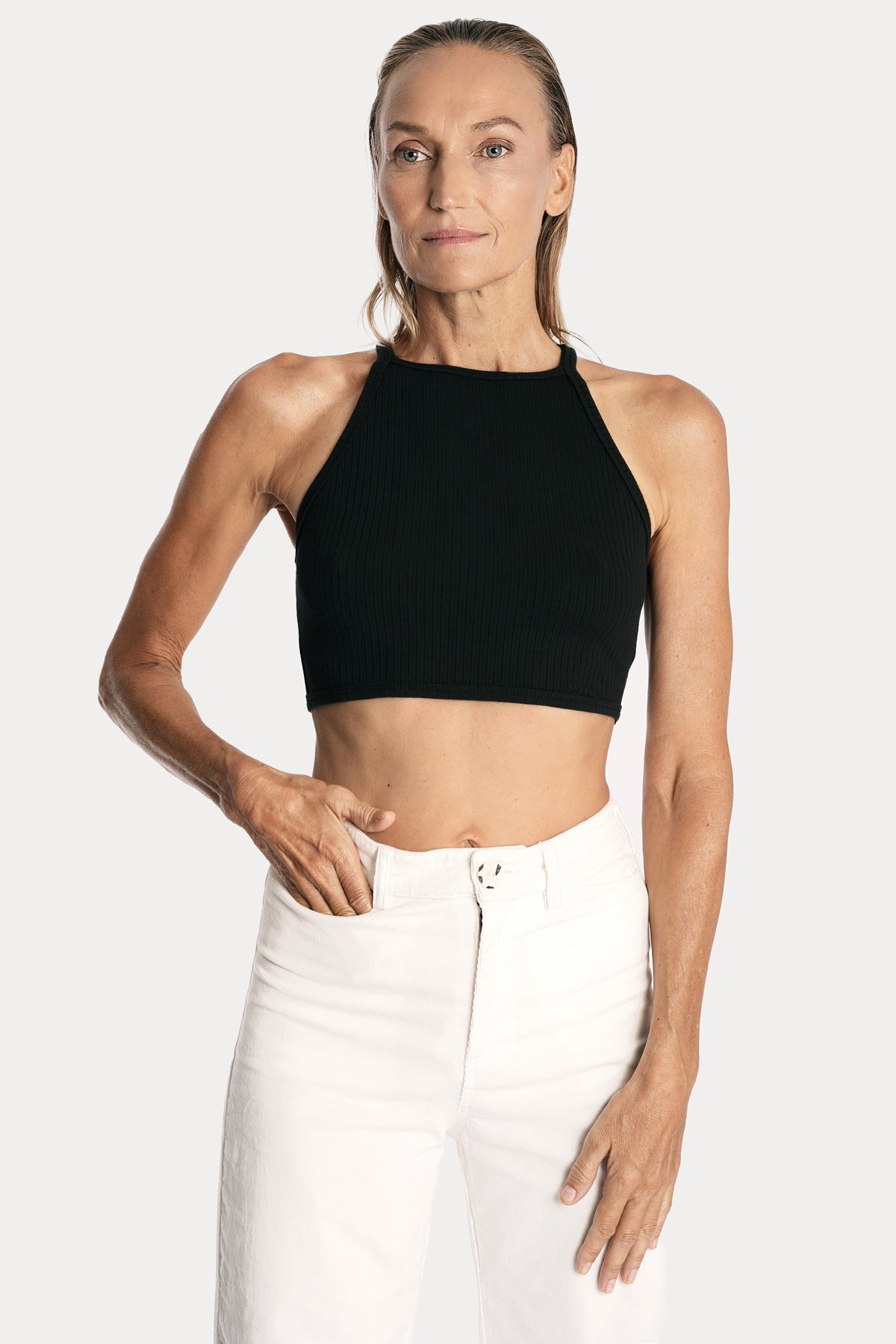 This minimal, well-considered crop top, featuring a flattering high neckline with fixed straps, is an everyday capsule wardrobe essential. Crafted with soft, eco-friendly ribbed LENZING™ ECOVERO™ that feels great against skin, this top pairs effortlessly with almost any casual bottom as well as under shirts and jackets for a versatile, layered look. For a perfect athleisure ensemble, match it with eco rib biker shorts or stirrup leggings - ideal for yoga, spinning, or pilates class, or simply lounging in relaxed comfort at home. Seamlessly combining comfort and effortless cool style, this understated crop top is simply a daily go-to piece, elevating any casual outfit with ease.